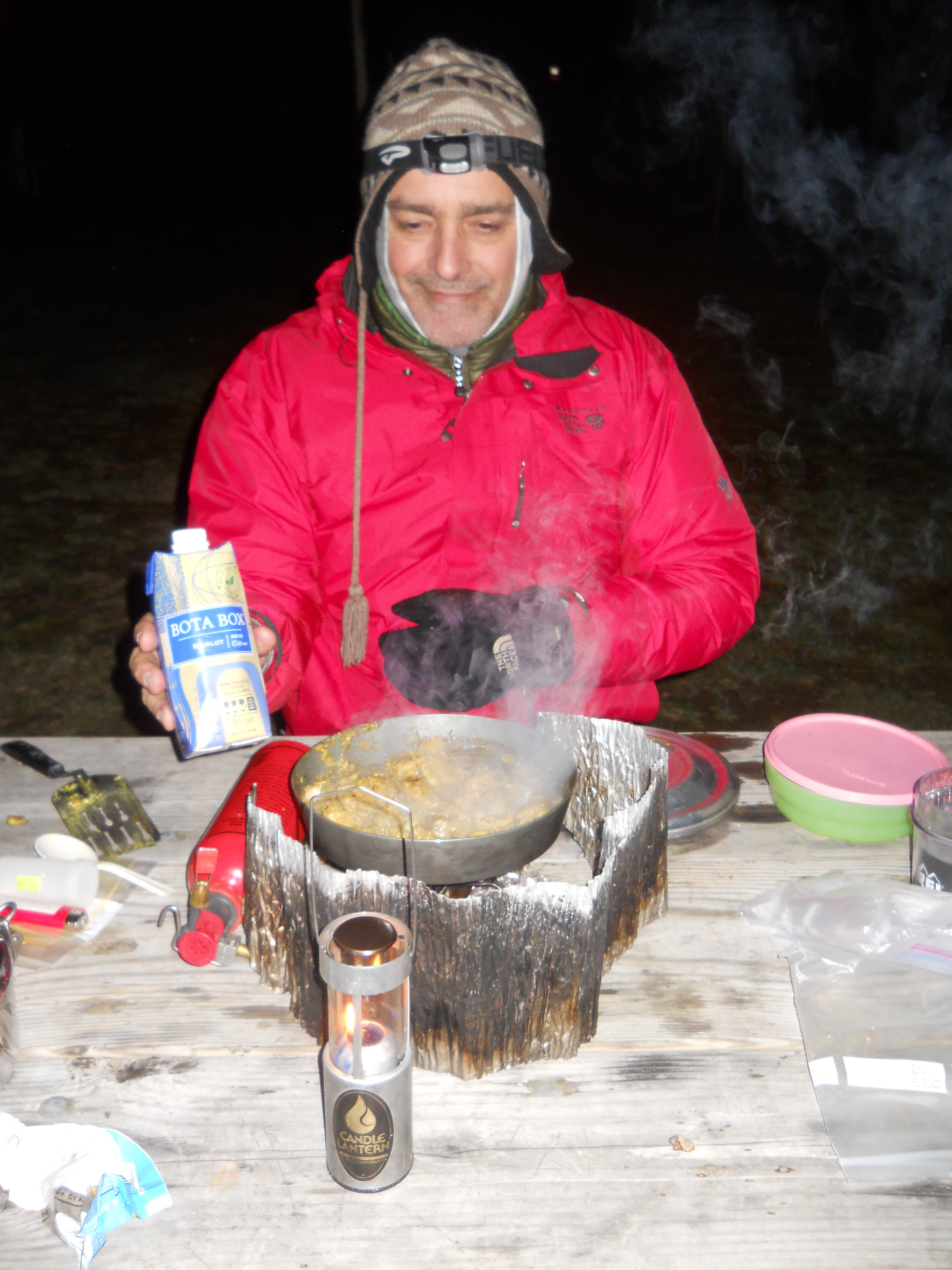 Day 1: Dinner: Pork Vindaloo and curry brown rice (homemade – including grinding the spices) paired with Bota Wine – Merlot (it is a good thing everything tastes better when camping).