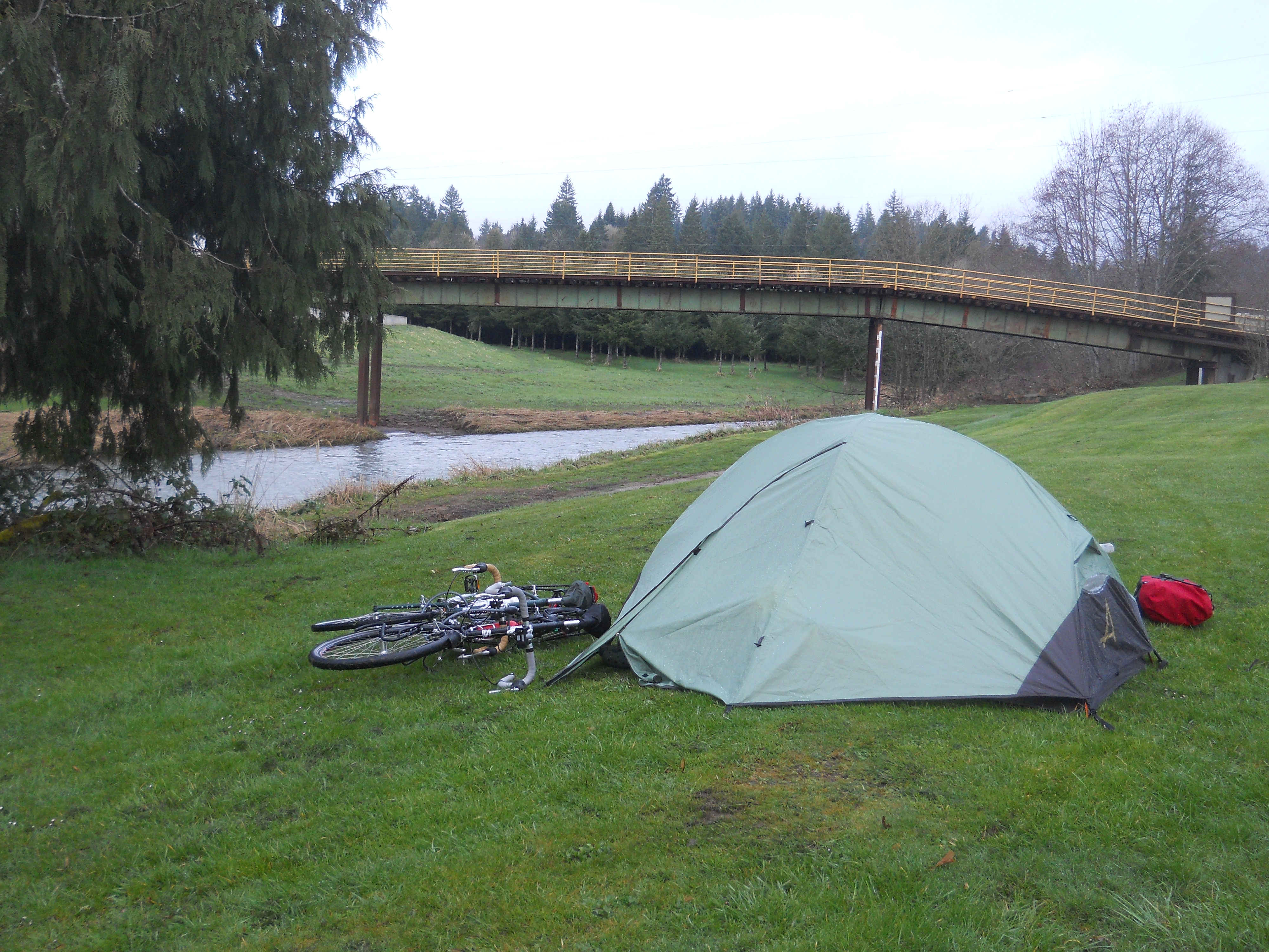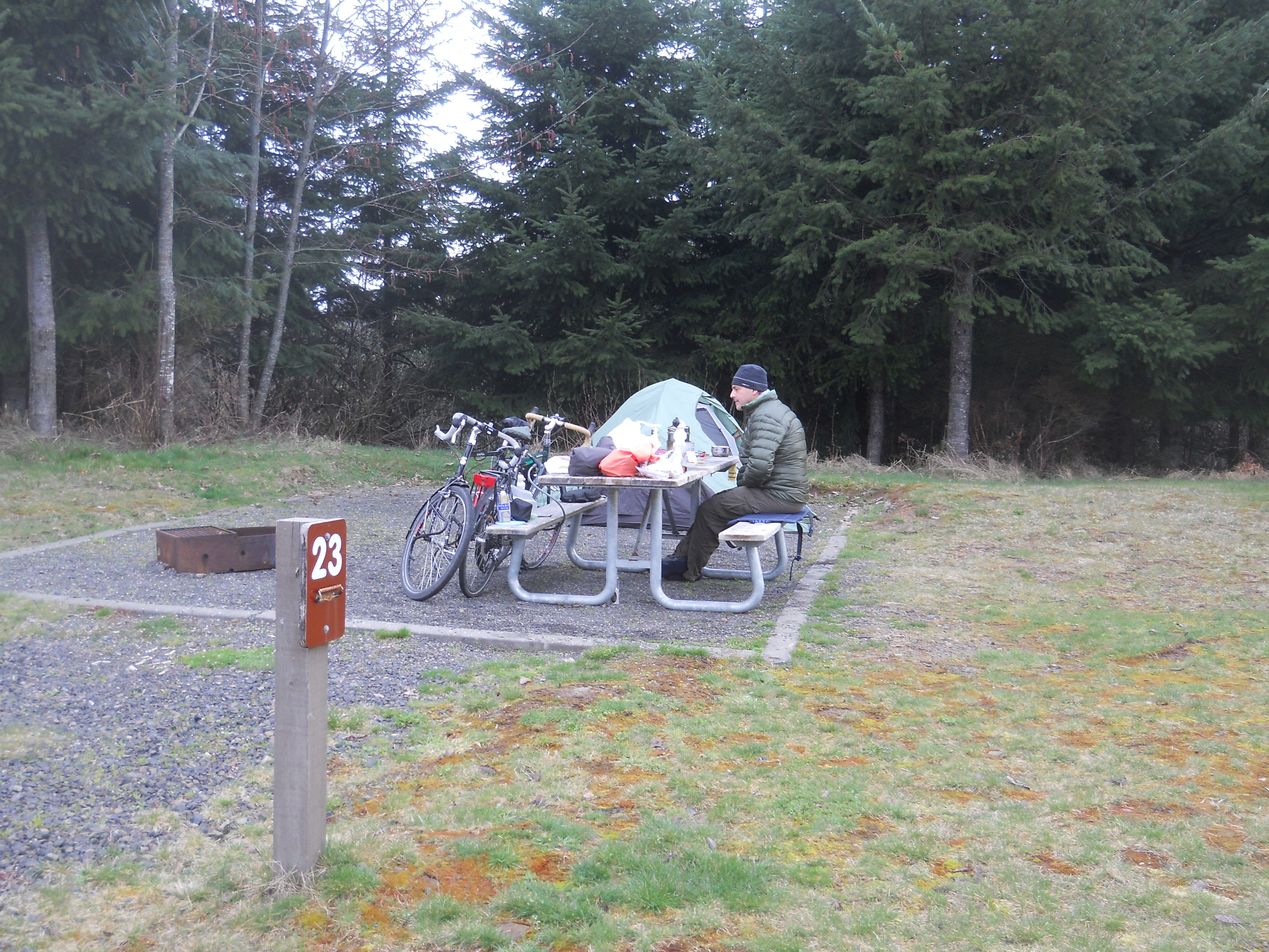 We intended to leave at noon…but I (JP) had to go to Yoga at 10am and still needed to pick up the last few food items. We finally rolled out of our drive way at 2:50pm on Saturday leaving just a few hours before dusk. We had a very pleasant, chilly, mostly uphill (although slightly) ride north through Yamhill and Washington counties to Stub Stewart State Park.