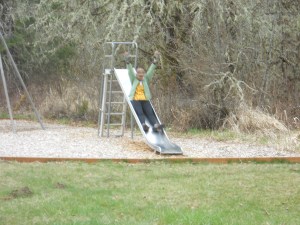 Our second day of riding took us on a different route than Jay had initially mapped out. The original plan had us exploring 20 or so miles off road in the hills around Vernonia. We rode 12 miles down the Banks – Vernonia rails to trails route into Vernonia where we lunched at the Blue House Mediterranean Café, Expresso Bar and Brew House, right on Hwy 47 in downtown . Warm chai tea, chicken gyro sandwich, hummus plate and creamy borscht were the ticket for another chilly morning ride. We decided we would benefit more from miles and time in the saddle than exploring the backcountry hills. It was a trade off – but, in retrospect, it was the right decision. We rode north on Hwy 47 to the unincorporated town of Mist, looking for a cafe. Surprise, Mist is little more than a beautiful crossroads in the hills with no apparent services. So we took a snack and stretch break and a few trips down the slide at the local school house.