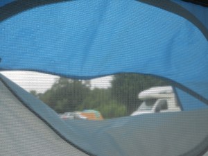 Sunday morning I woke up at 6am having desperately to go pee but it was pissing down rain; too wet for the 200 yard sprint to the loo. As one does, I laid there waiting for the rain to let up so I could make my mad dash across the camping field and not get soaked. As soon as I returned to the tent- the rain again started pouring down making the two of us pack up the tent from within resembling a game of tangled twister. Packing the tent away wet is always disconcerting, especially since I am carrying the tent. I think I had 10 extra pounds of water on the back of my bike! All part of the adventure.