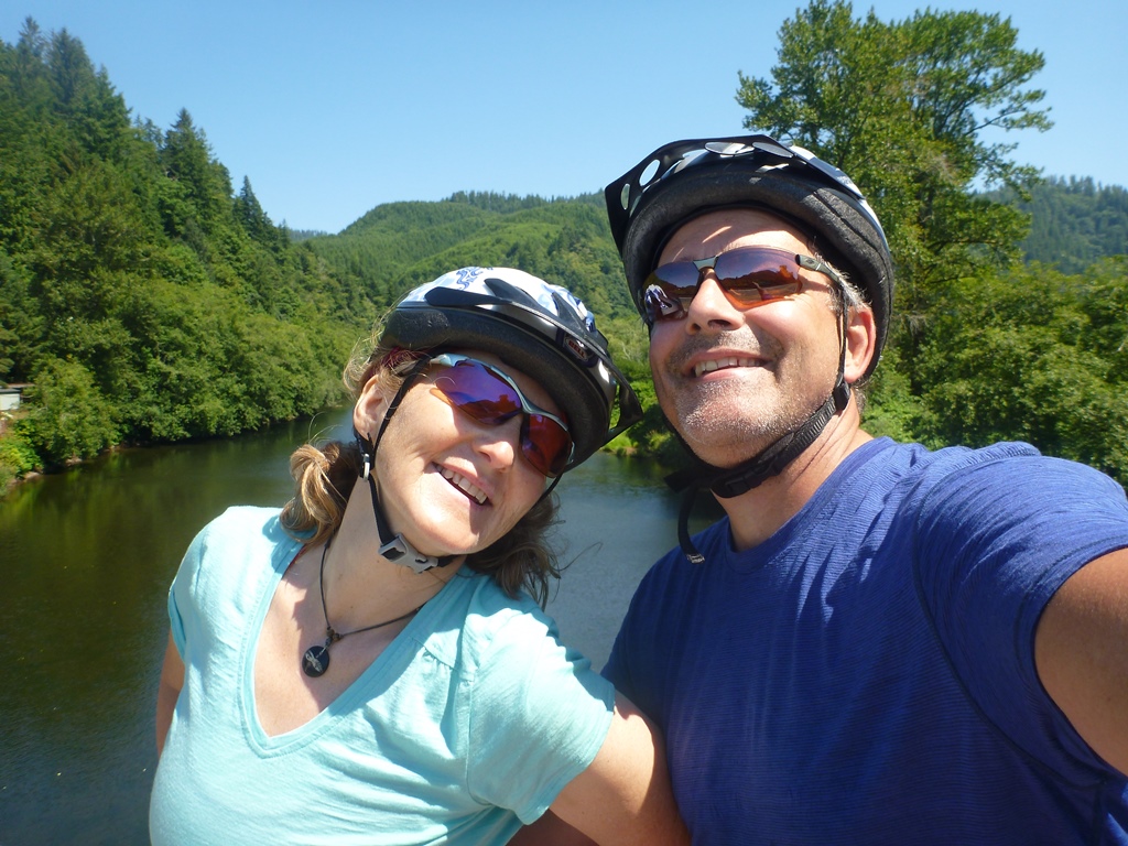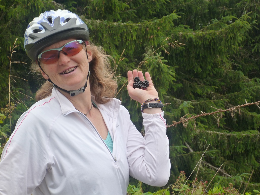 The sky was slightly overcast and the temperature was still cool enough to enjoy the brisk air before the day heated up too much. Continuing south on US 101, we passed through a few communities marked on the map that either had no brunch options or just slept through Sundays. Janet did notice a good number of ripe blackberries within easy reach so we took a short break before leaving the Nehalem River and had a quick snack. Janet had just a few more…