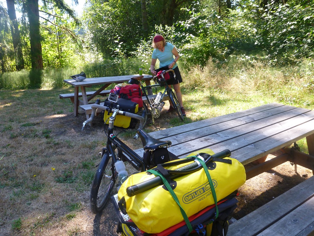The descent began with a loud yell as we dropped nearly 400 feet in the first mile. Much to our surprise and dismay, we then started to climb again. In the next 1.5 miles, we regained all that elevation loss and found ourselves back at 1370 feet. The following 6+ miles of downhill were gloriously smooth with wide turns as we were cooled by the airflow as much as the drop in temperature. We rolled into Clatskanie with huge grins on our faces ready to make camp, shower and eat.