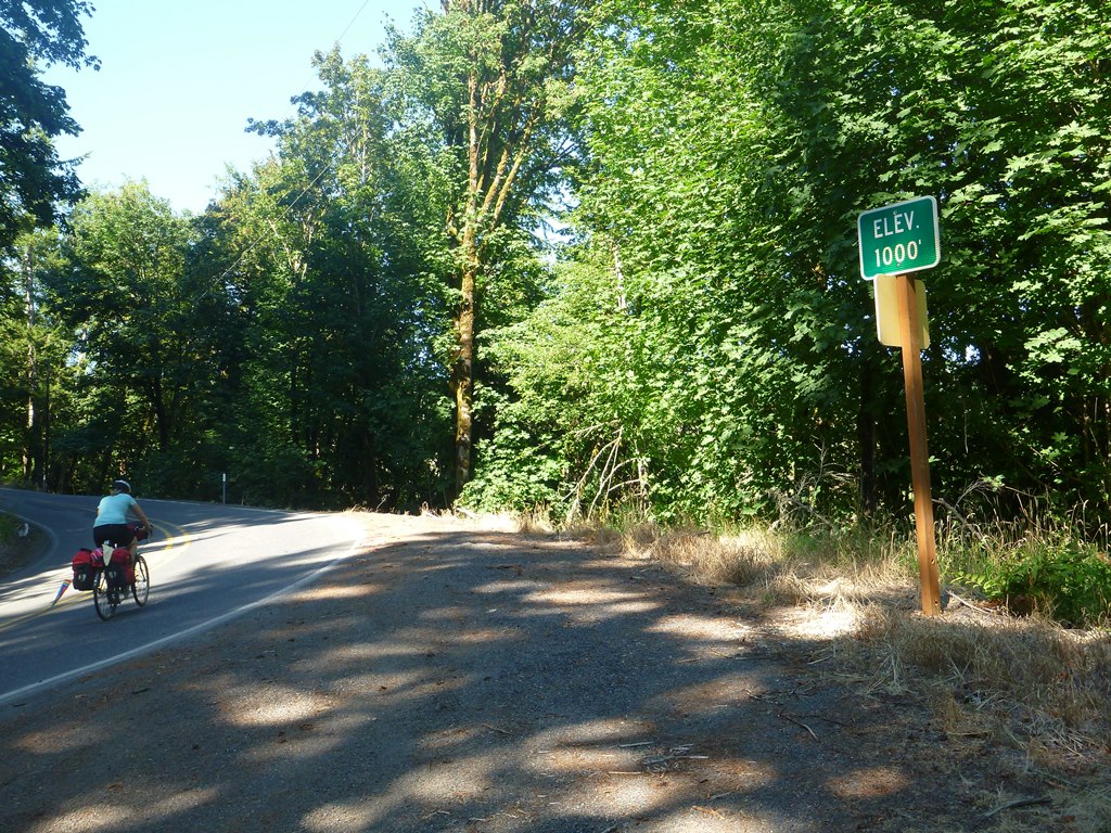Continuing on to Mist, we turned north once again and, within a mile, began the short but sweet climb over the mountains forming this part of the Columbia Gorge. Mist sits about 700 feet above sea level and Clatskanie is right on the Columbia. In between these two is Misty Mt pass at 1370 feet, just over 2.8 miles from Mist and 8 miles from Clatskanie. This is a steep climb in any condition but in the heat of the day and with much less water consumed than we’d like, it was a slow but steady slog to the top. Large trucks crossing over are diverted to Apiary Rd, a bit east of here, due to the steepness and tight turns.