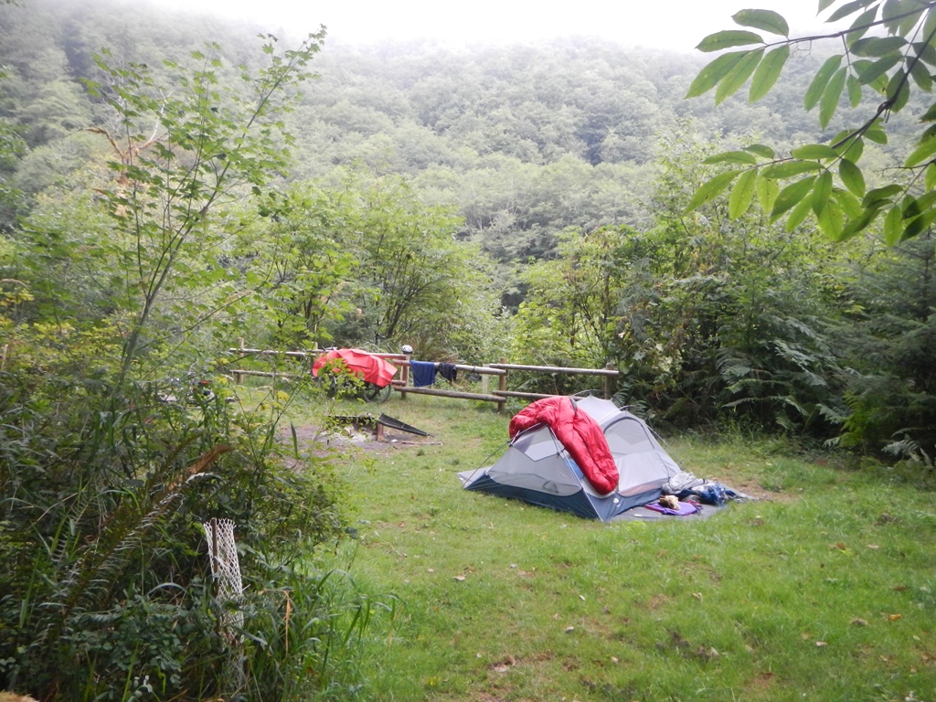 A joyously quiet night with only the crickets, frogs and lazy river making any noise. As we expected, camping just above river level meant a rather moist morning. While the rain fly, sleeping bags and a few sundry items air out, Jay fires up the Trangia stove and tries to make pancakes on an alcohol burner for the first time.