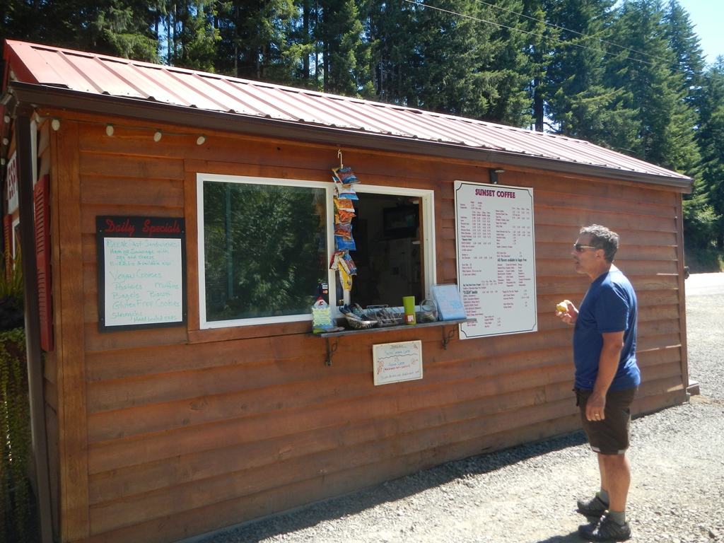 We continued to cover miles of steep ups and downs until we regained the pavement and headed towards US 26, looking for our second breakfast. During previous trips to the coast we’d noticed a little coffee kiosk, Sunset Coffee, just west of where we met the busy world. A short, downhill ride later we discovered Sunset also served food! But so many choices aren’t always the best thing for a hungry cyclist.