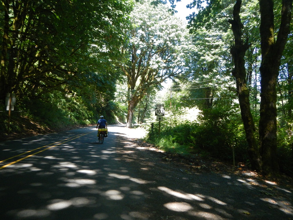 We turned the corner from US 26 to OR 103 and continued our journey northward, following the Nehalem River upstream. OR 103 is the wonderfully quiet, low traffic rural roadway that makes touring on pavement so attractive. While slowly gaining elevation, we crossed back and forth over the river, passing serene farmland and tree-covered foothills.