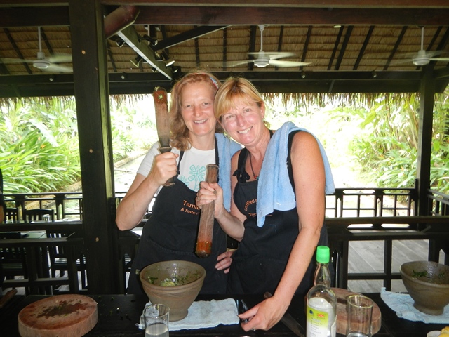 Chi was an excellent instructor. He first described the course we were to prepare, then demonstrated how to prepare it- then helped us as we fumbled through the execution of the dishes. The main kitchen tools we used were the clay fired mortar and pestle, a large chef’s knife and chopping board and a pairing knife- that’s it! Once the food was prepared and cooked, we all sat down to enjoy a feast – one which we proudly prepared.