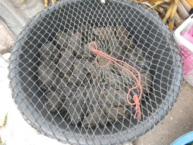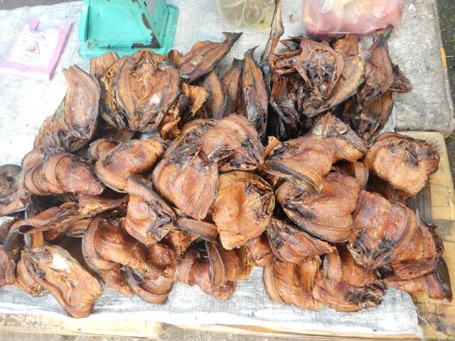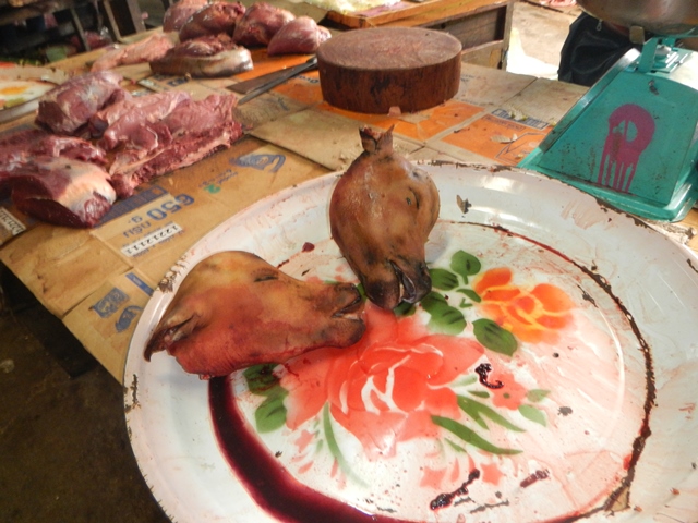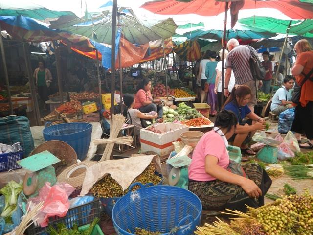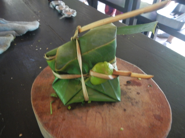Our first stop was a neatly laid out display of many of the ingredients used in traditional Laos cooking: Bamboo shoots, lemon grass, coriander/cilantro, dandelion leaves, mint, lime, three kinds of basil, chilli (Mak pet kinou- small but hot), cloud ear mushrooms, garlic (Lao garlic, much better than Chinese variations, according to Chi), fish sauce, galangal (similar to ginger), Kaffir lime, spring onions, tamarind, and of course, several varieties of chili peppers. Chi spent a good 20 minutes explaining each Herb, its uses and where it grows. We then were given a tour of the market including, the optional meat “counter” where whole animals are butchered. The most commonly eaten meats include fish, chicken, pork, beef and water buffalo. There are also a variety of alternative meat choices such as larva, crickets, frogs and spiders. Having recently fallen off of the vegetarian band wagon and being relatively selective about my protein sources, I opted to not eat any of these.