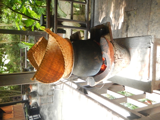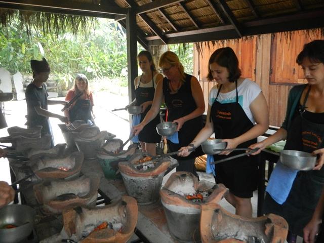After another short Tuk Tuk ride up a windy, pot holed dirt road, we arrived at the beautiful Tamarind cooking school “campus”. A serene setting complete with water lilies and lots of very young and very cute puppies. There were 12 students and we each had our own cooking station with all the necessary utensils. Our heat source was in the form of a traditional clay and tin brazier- a sort of clay pot charcoal grill that is commonly found in many Lao homes to this day. The demonstration table at the front was laid out with all the ingredients we would need for the day.