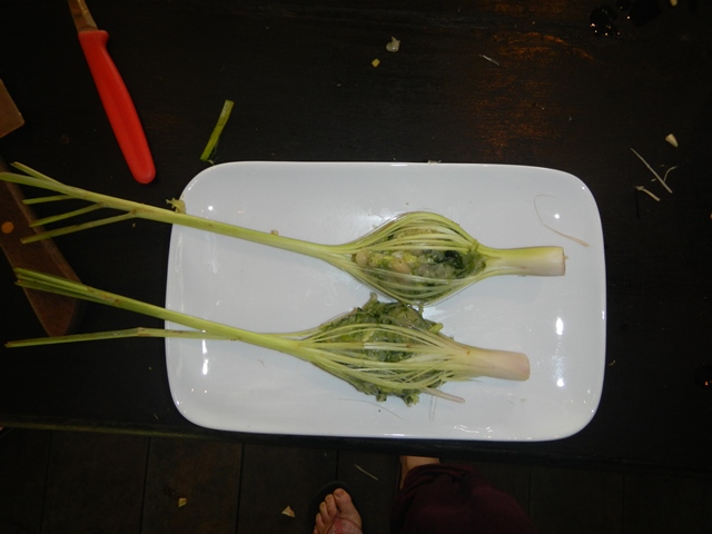 Oua Si Khai: Lemon grass stuffed with chicken- tricky execution – Christine mastered it! I failed miserably and Chi helped me out.