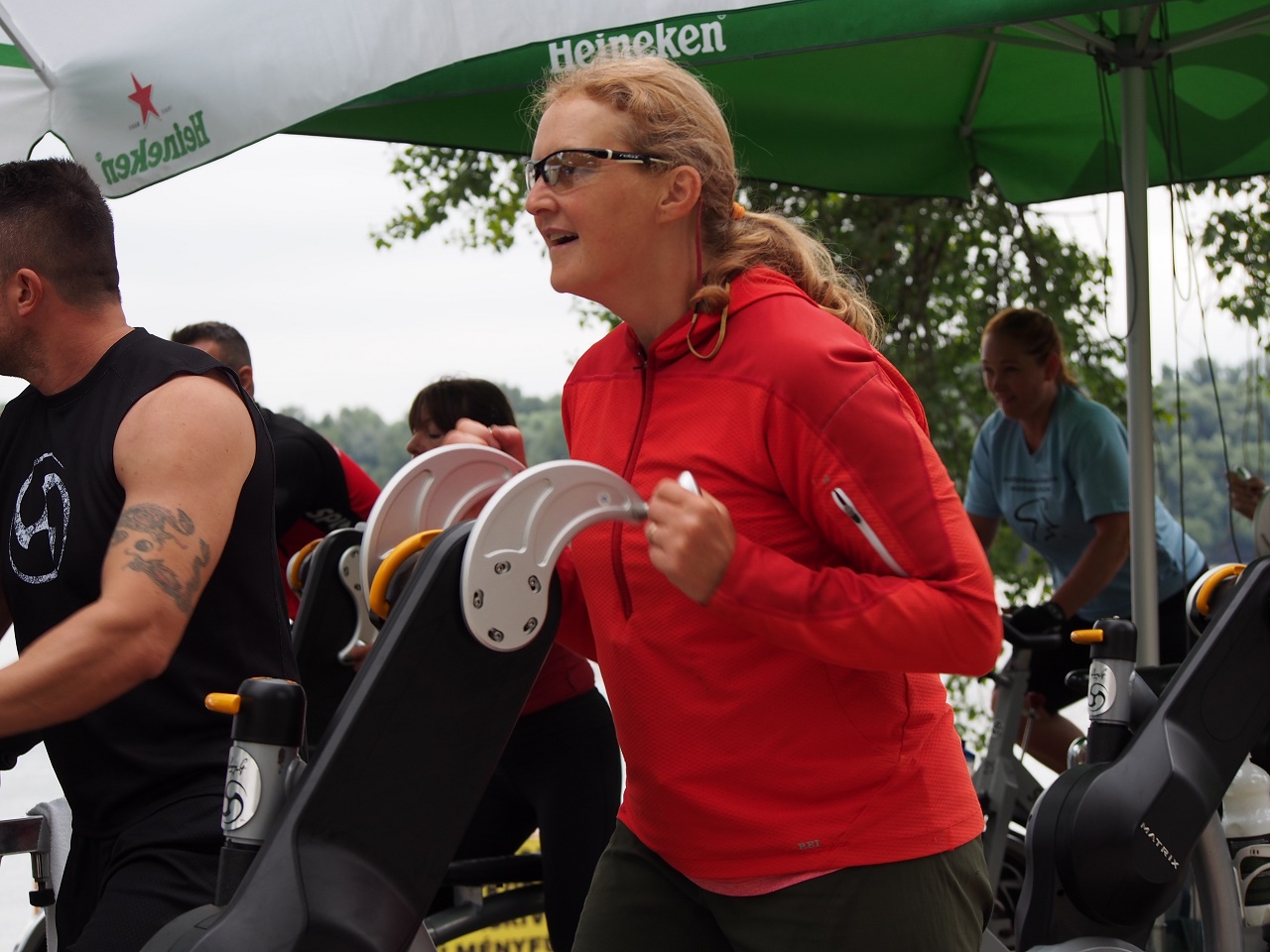 We came upon the best spinning class I have ever seen. Right on the river edge, with both leg and arm ergometers (cycles) and complete with a live conga drummer.  We stopped to egg them on and I was coaxed into having a go with the arm ergometer.  A little uncoordinated but I got the hang of it!