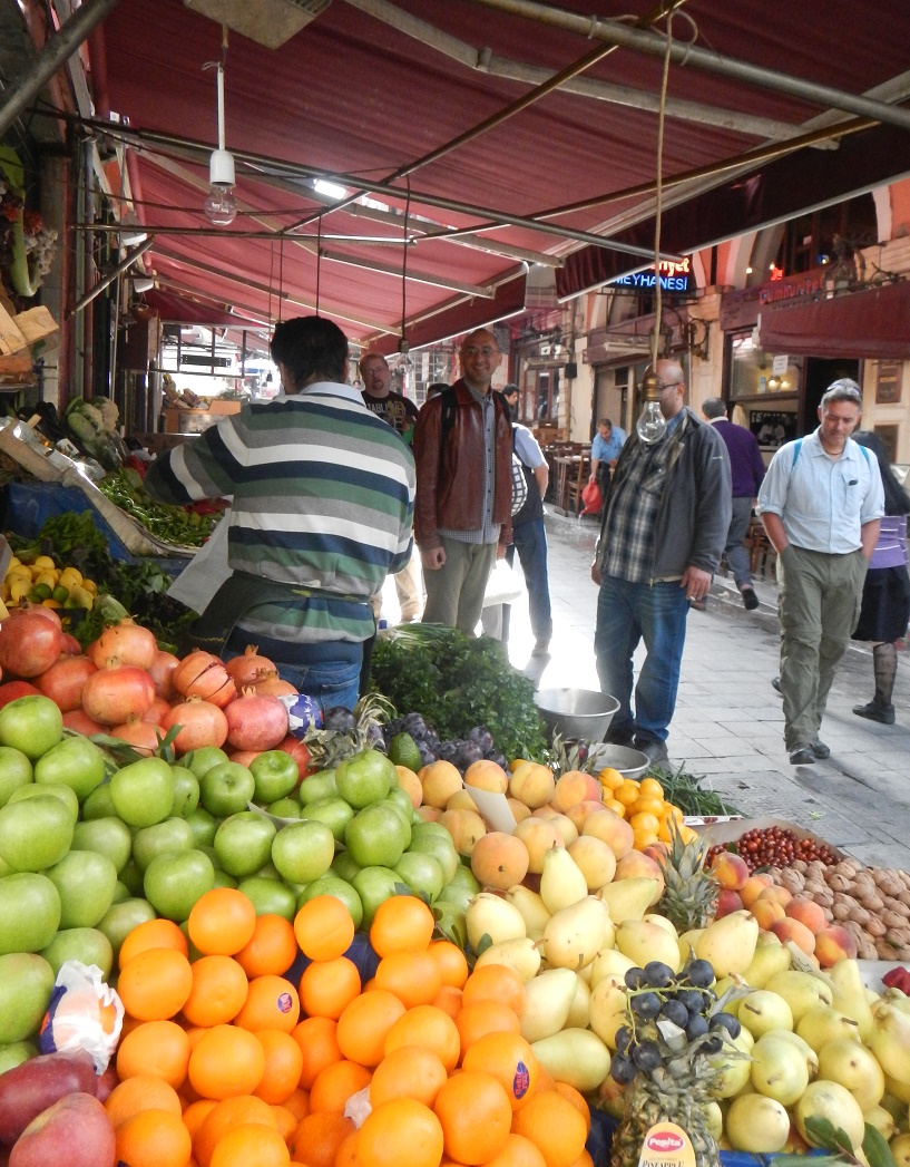 One of our favorite days in Istanbul was spent as students in a cooking school – which you can read about here. The Istanbul Cooking School was located on the north side of the Golden Horn (on the European side) in a district referred to as Beyoğlu. This area is considered to be the economic center as well as the happening night life area for tourists. The shop, bar, hotel and restaurant lined Istiklal Avenue stretches from the Ferry terminal up the hill to Takism square.  This is the acclaimed party spot of Istanbul – at least that is what the tour books and websites claim.  We took the Fernicular (underground metro) up to Takism square and slowly strolled down Istiklal Avenue. We found that the small streets coming off Istiklal were much more interesting than the avenue itself.  The avenue is lined with modern, expensive brand named stores – we knew we were in a touristy area when the first store we saw was Starbucks and the second McDonalds.  The side streets are packed with spice and fish markets and old interesting restaurants, just a bit off the beaten path.