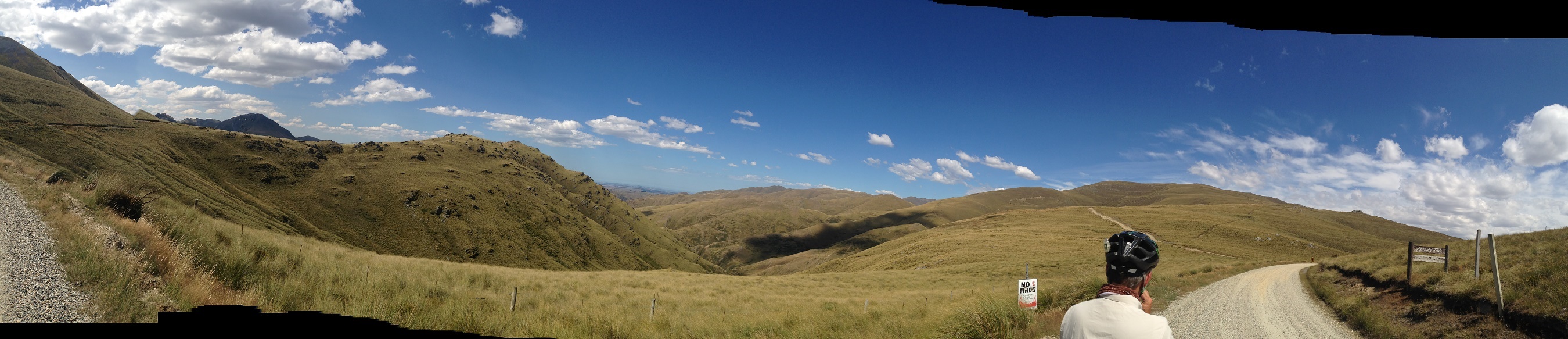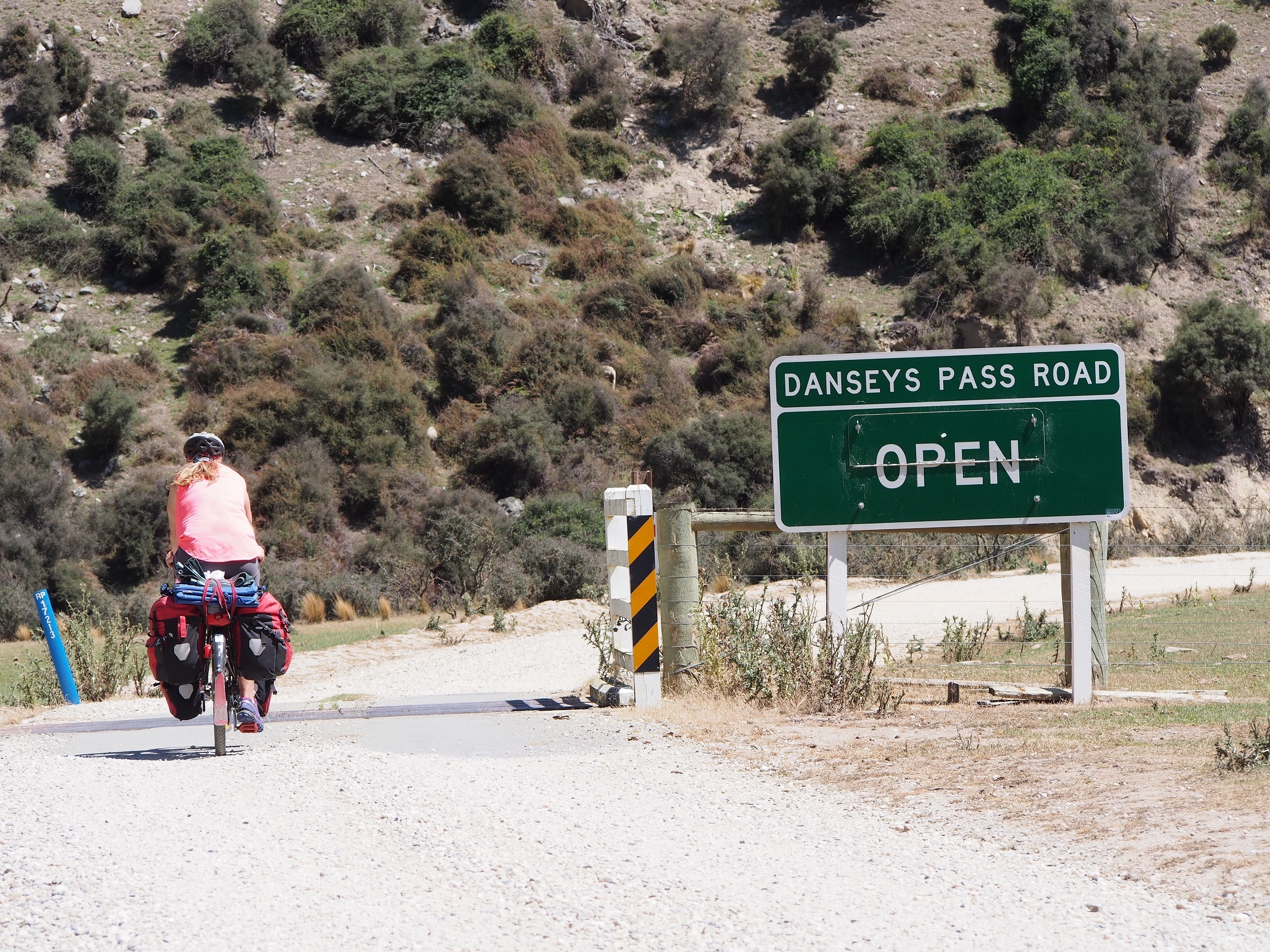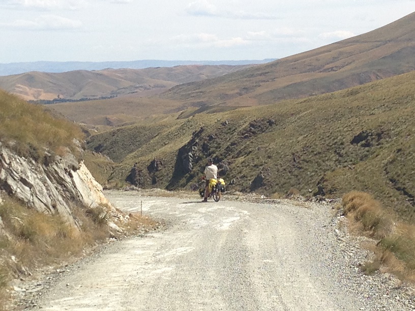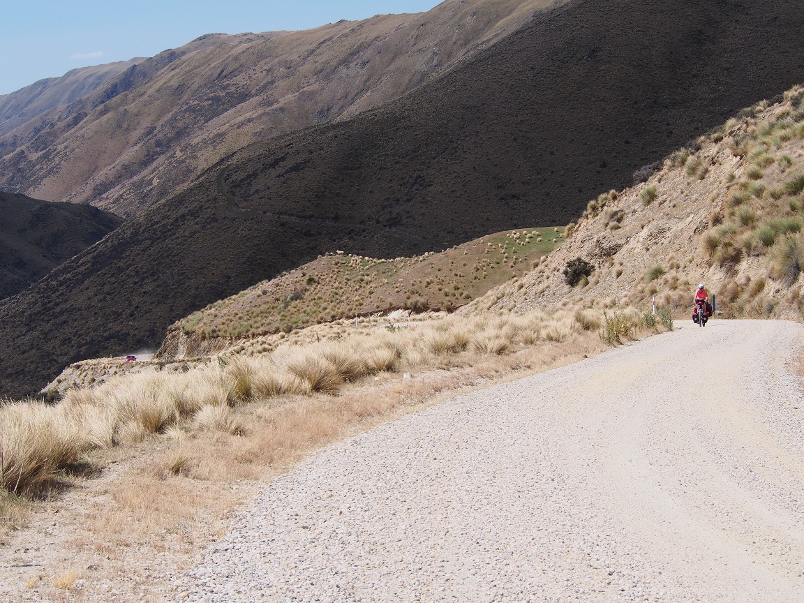 From the lavender shop the road continued to undulate with an upward trend until about 5 km from the top when it just turned up, steep. Up. On Gravel. Loose Gravel. And it was hot. We engaged our smallest gears and started the grind to the top. We stopped often to refresh with water and to say hello to the sheep and cows that stared at us as if we were crazy. We ran into a British couple, Luke and Flora, coming down the other way – who informed us that we were cycling the hard way up the pass, and into a head wind with loose gravel. They said the other side was a much easier climb, with less gravel and a tail wind. Thanks for that 🙂 They had just left Ranfurly, and the Warm Showers hosts to which we were headed. Always nice to hear good words about your upcoming lodging options.