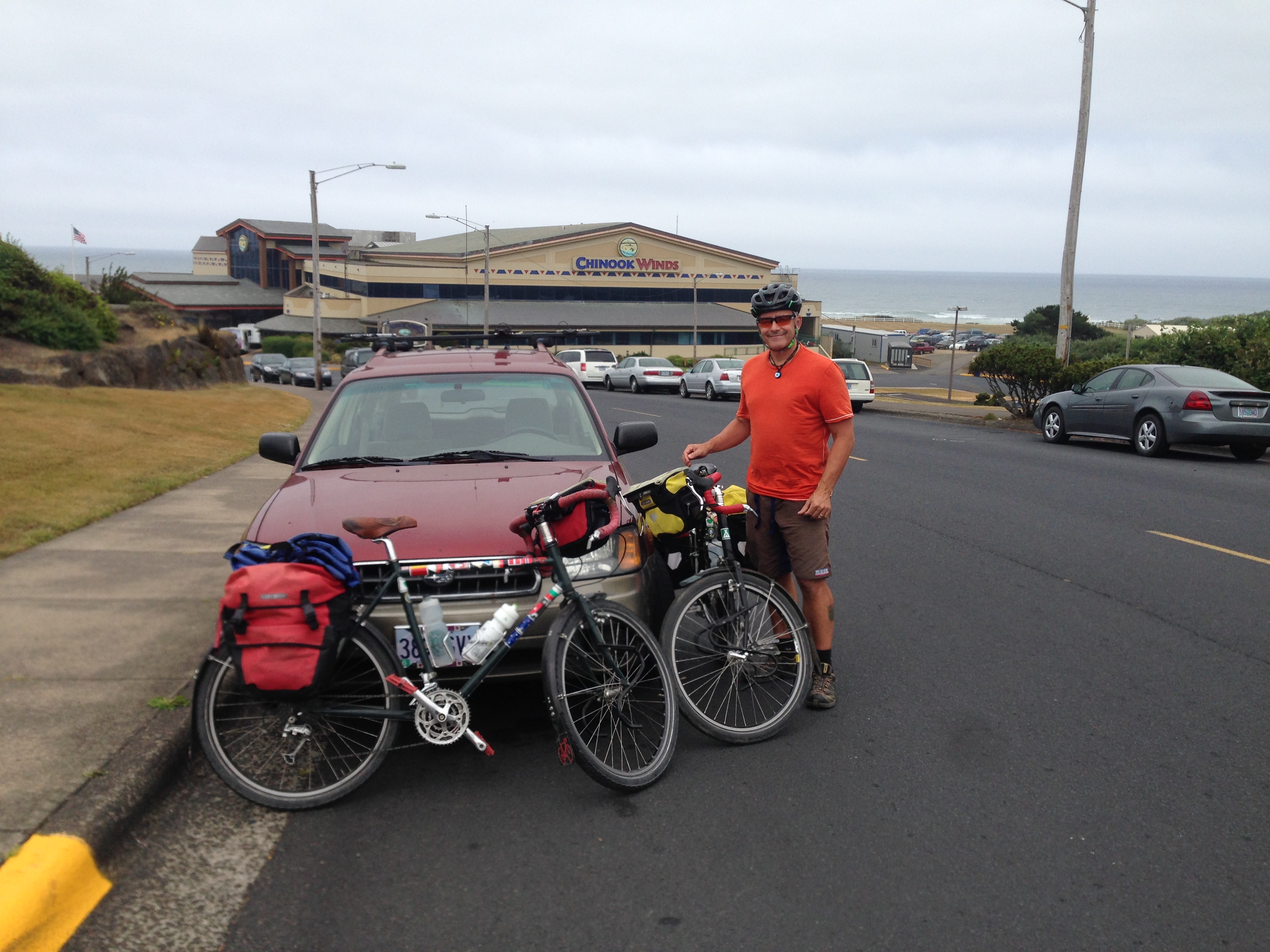 We are registered for the bike tour a month challenge (hosted by Path Less Pedaled) and July was slipping away fast. We originally planned on a local tour from our home in Newberg down to Willamette Mission State Park for a one night, two day tour. Our plans quickly changed to the coast as the Willamette Valley was forecast to be over 100 degrees (F) during the day. The temperature dropped easily by 20 degrees as soon as we drove over the Coast Range.  We found a safe place to leave the car just outside the Chinook Winds Casino in Lincoln City.  The ride from Lincoln City down to Newport was leisurely with a constant head wind (southerly) and the sun trying to break through the clouds.