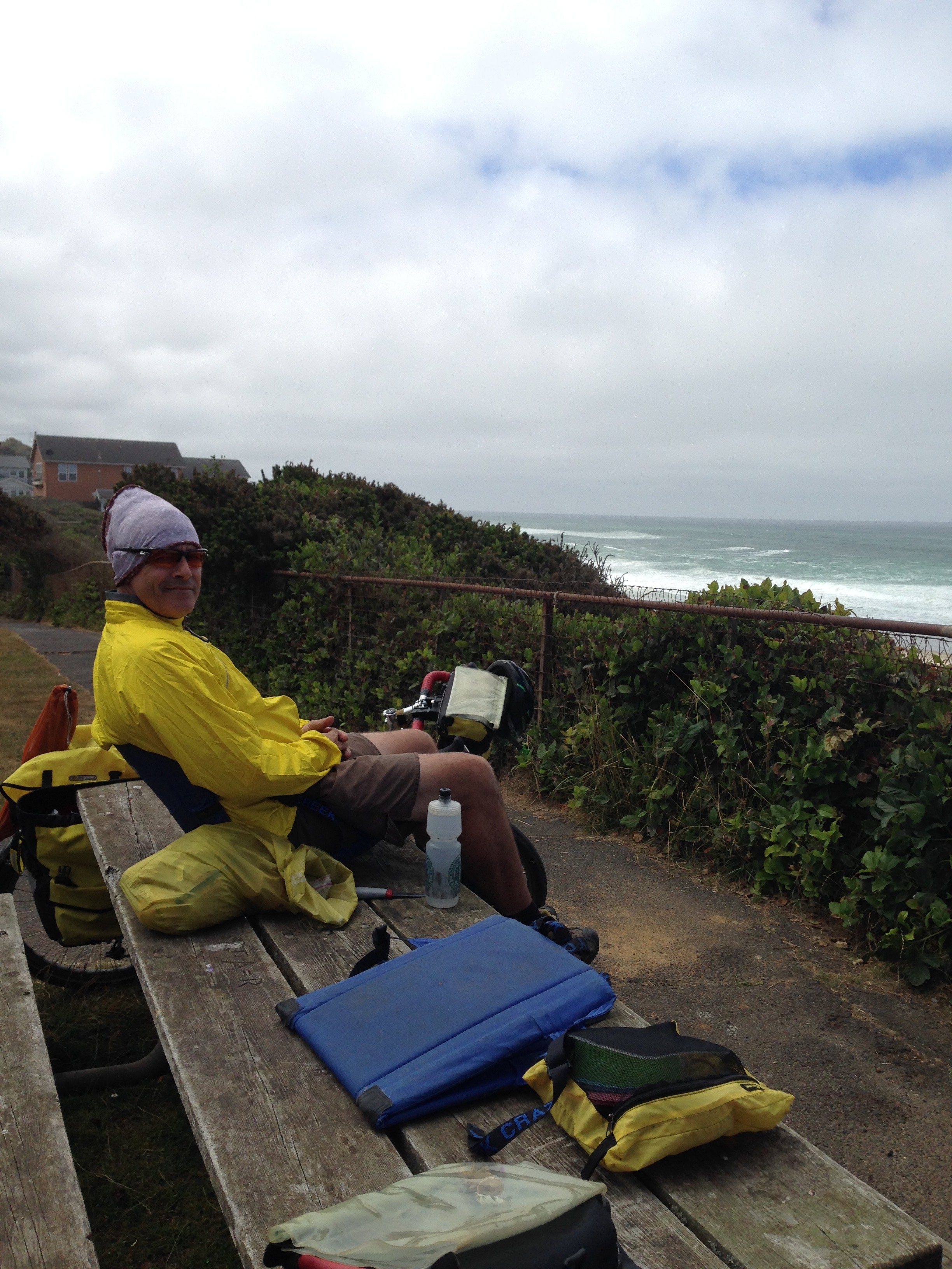 Many of the Oregon State Parks offer hiker/biker camp spots for $5 – $6/person (showers included) and they won’t turn you away – (as long as you are on foot or bicycle). The South Beach State Park campground put us at just over 30 miles and two past the Newport Aquarium – which was on Janet’s wish list.  Our camp spot was nestled among the fir trees in the first-come-first served hiker biker spots. There were five other bike tourers sharing the area – it was strange, but awesome, to be among so many other bike tourists. During much of our year tour we were often the only bike tourists in a campground.
